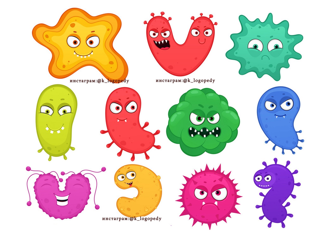 Как изготовить: на каждую бактерию (название можно придумать) с обратной стороны крепится картинка, далее-ламинируете. На сачок, с обратной стороны прикрепляете двусторонний скотч. Ребенок собирает сачком каждую бактерию, открепляет от сачка и называет, что изображено.